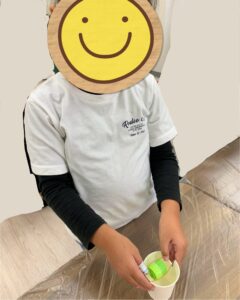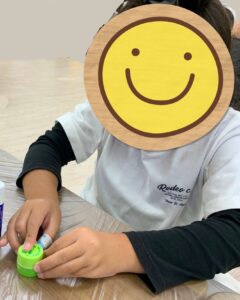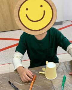 その後は、最初に自分で選んだ体のパーツをのりやセロハンテープを使って紙コップに貼り付け、顔を描きました。