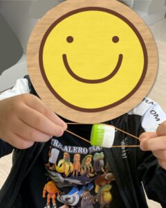 「こんな感じ?」「ビヨーン」と楽しそうにゴムを引っ張り、確認していました🎵