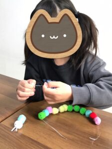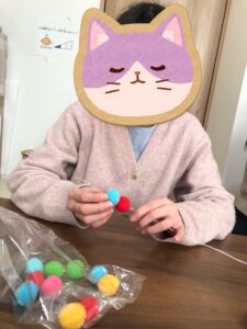 針金にデコレーションボールを付ける時、固いところもあり少し難しい様子でしたが、コツを掴んだ生徒さんが「こうしたらいいよ」と他の生徒さんを手伝ってくれました。
