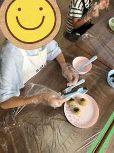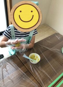 「器を持ってこぼれないようにつぶそうね!」とアドバイスを伝えるときちんと器を持ってつぶすことができていました!