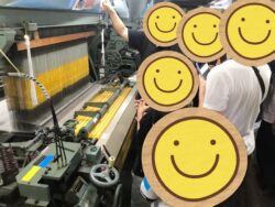 施設に到着してからは工場見学の班と手織り機体験の班に分かれ、早速活動をスタートしました。工場見学では施設の方から博多織の歴史や作り方を教えてもらいながら、実際に織機が動いている様子を間近で見学することが出来ました。