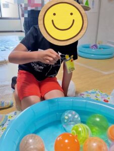 こよりを使って自分の好きな色のヨーヨーを狙っていきました😆