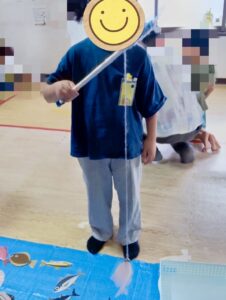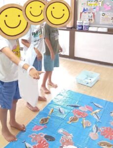 マグネットがついた釣り竿でクリップがついた魚を時間内にいくつ獲ることができるか、班の人と協力するチーム戦で行いました!