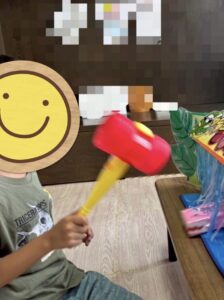 箱の中に隠れたワニさんが顔を出したときにタイミングよくピコピコハンマーで優しく叩いていきました🤩