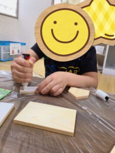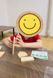 「今日は何を作るか知ってますか?」という職員の声掛けに「貯金箱ー!」、「家!」と元気な返事が返ってきましたよ😄