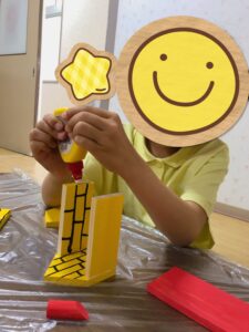 ボンドを塗る場所を確認して、ボンドを塗りました。集中して、みんな上手に塗ることができていました。